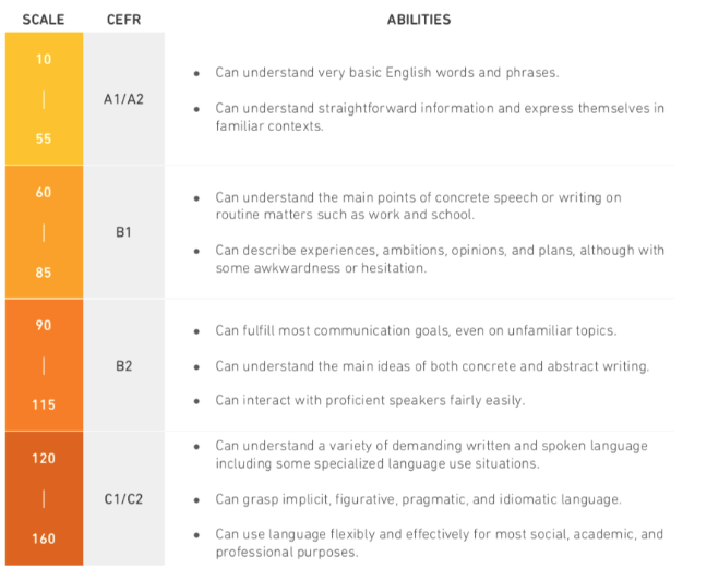 The Duolingo English Test measures English language ability using a scale that ranges from 10-160 and is scored in 5 point increments. This scale is broken down into the following main categories: